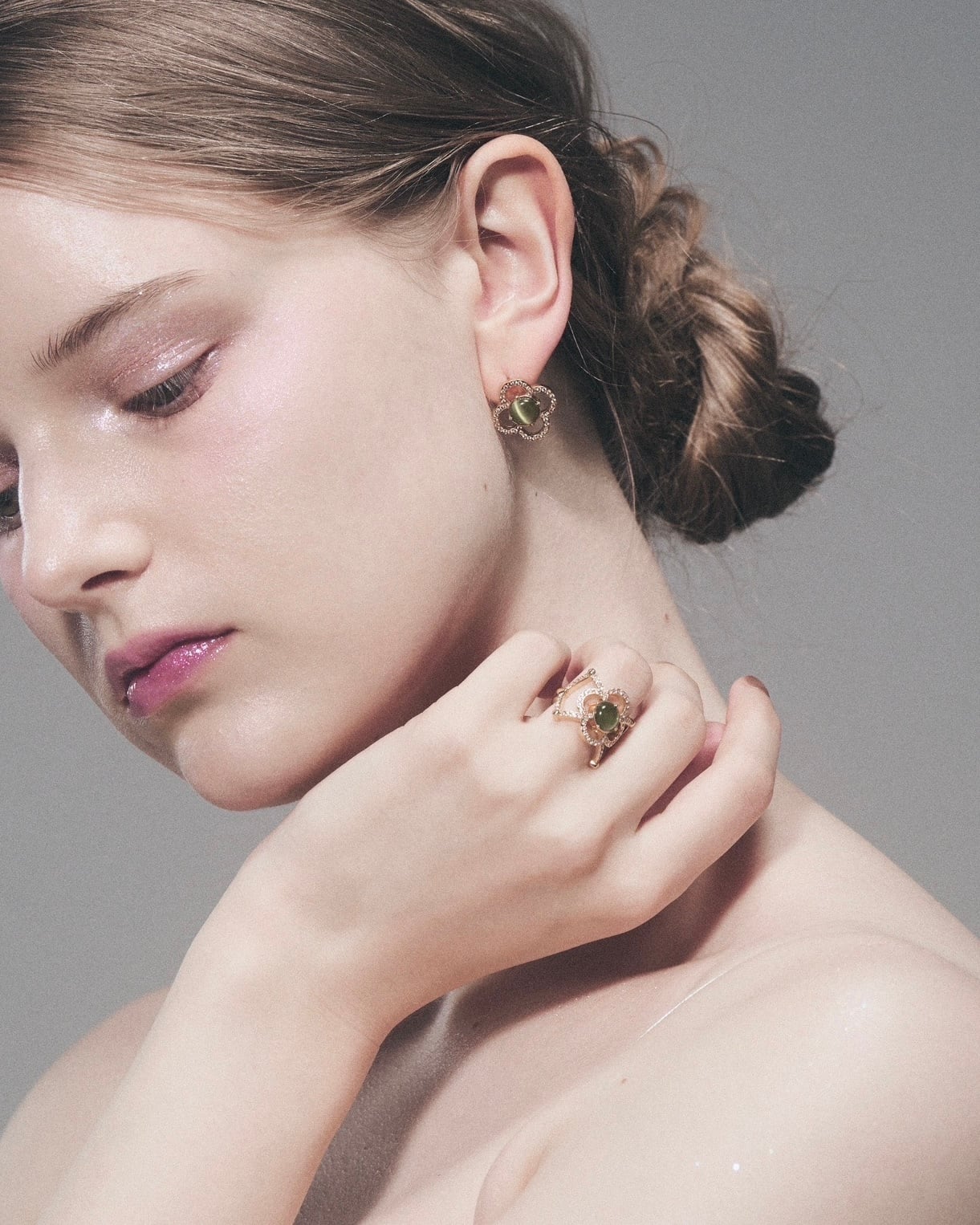 ホルテンシアとは、フランス語で「アジサイ」をさします。トップは緑色の紫陽花(アナベル)をイメージにキャッツアイオリーブをあしらい、花びらには視線を奪うように輝くシャンパンカラーのキュービックジルコニアを施しました。